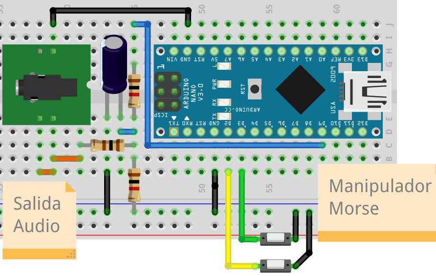 Para generar los puntos y las rayas utilizamos un arduino. Este genera el tono de 700 Hz con un tiempo diferente para los punto y las rayas.